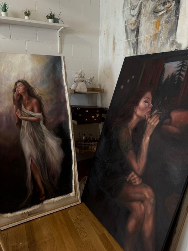 Das Gemälde mit dem Titel "Die moderne Frau" spiegelt die Komplexität des Lebens wider. Dieses Bild zeigt eine Frau, die jugendlich aussieht, deren Hände jedoch alter erscheinen als ihr Gesicht. Diese