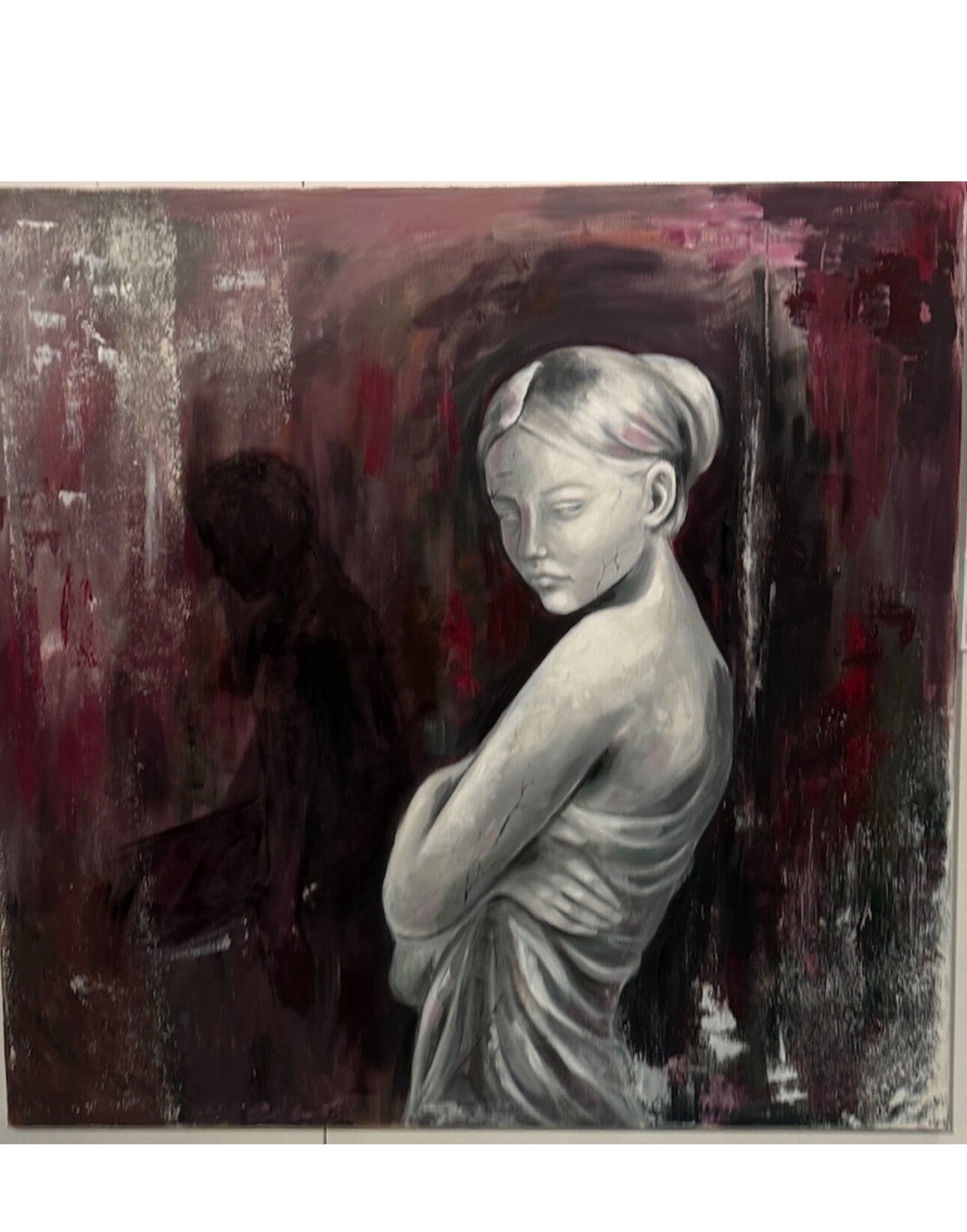 symbolisiert die Gefangenschaft ihrer Emotionen. Im Hintergrund ist der Schatten eines Mannes angedeutet, der vergangene Beziehungen oder unerfüllte Wünsche repräsentieren könnte und das Gefühl der Einsamkeit verstärkt. Dieses Gemälde hat auch einen zweiten Teil, der das Bild mit dem Titel „Die Kunst der Gefühle" ist."